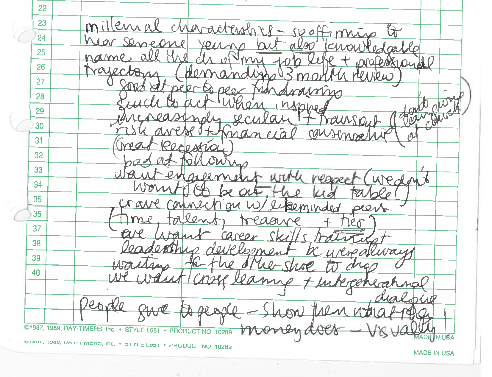 Recently I attended a professional development program that included a workshop about engaging millennials in fundraising efforts. The presenter was my age and she started her workshop by listing some general characteristics of our generation: we’re risk averse and financially conservative because we graduated from school at the height of the Great Recession, with more college debt than any previous generation; we’re quick to act when inspired; we want engagement with respect—meaning we don’t want to be at the kids table; we value connections and leadership development opportunities and feedback. We’re the ones, she said, who will demand a three-month review at work. (I have only done this once…) It was enough to make this stoic Presbyterian want to stand up and shout AMEN.
