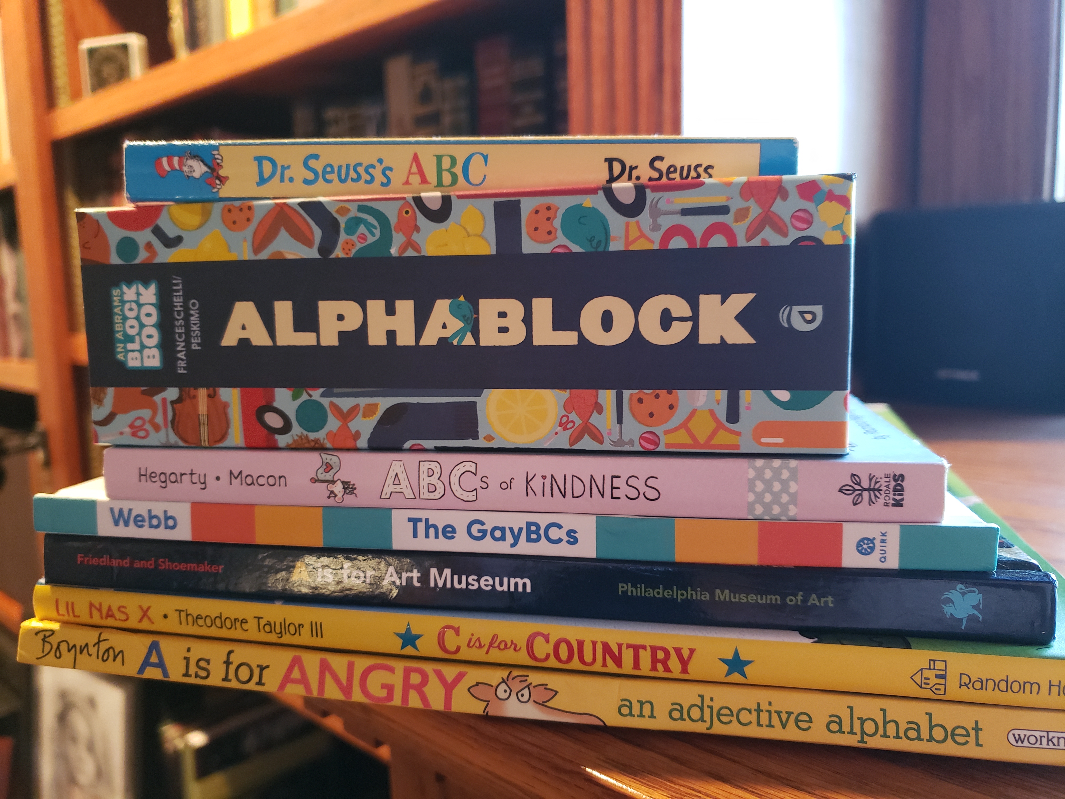 Or maybe it’s because the alphabet is such a key organizing principle for our life. Most of these books are an alphabetic list of some kind, and because of that, it’s easy to see our priorities as a family when you look at this small stack of alphabet books: museums, inclusion, imagination, emotional intelligence. (The Alphablock seems to be an outlier: it’s not the ABCs of a particular group of things, it’s just a random assortment of items that begin with each letter of the alphabet.) More than that, though, these alphabets reflect our commitment to a literary life, a life where books and reading play a central role in our son’s engagement with the world around him.